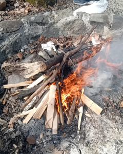 A Zsivány-szikláknál megálltunk, tüzet raktunk, és előkerült a szalonna. A fagyűjtés, a tűzrakás, a sütögetés – mind olyan tevékenységek, amelyek kézbe adják az embert, és amelyekhez nem kell magyarázat. A tűz mellett az idő máshogy telik: lassabban, meghittebben. Szó esett mindenről és semmiről – és ez pontosan így volt jól. Volt, aki először sütött szalonnát nyílt tűzön. Volt, aki régen csinálta utoljára, és most valami régi, meleg emléket hozott vissza ez az egyszerű mozdulat. A tűz körül ülve nem kellett semmit teljesíteni, semmit bizonyítani – csak jelen lenni, enni, beszélgetni, nézni a lángot. A tavaszi levegő, a mozgás és a jó társaság után a harapnivaló különösen jól esett. Hazafelé menet mindenkin látszott, hogy valami feltöltődött – nem látványosan, nem hangosan, de valósan.