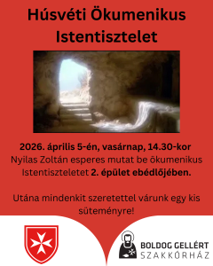2026. április 5-én, vasárnap, 14.30-kor Nyilas Zoltán esperes mutat be ökumenikus Istentisztelet 2. épület ebédlőjében.