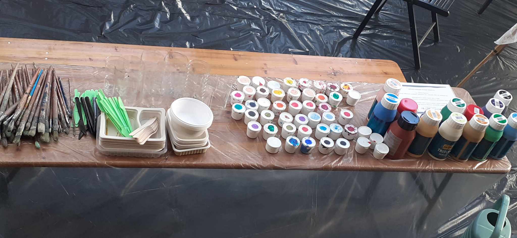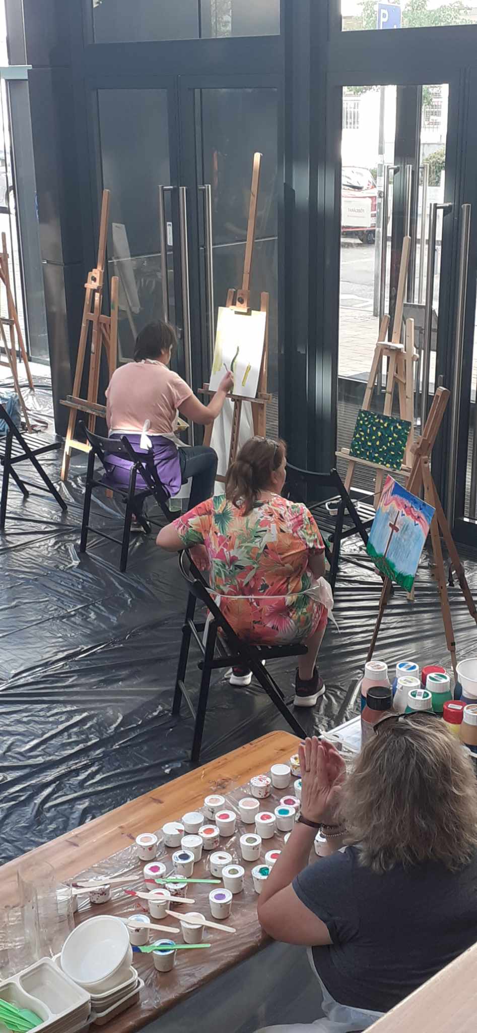 Művészetterápiás csoportunkkal ellátogattunk a Moravcsik Alapítvány 13. PsychArt24 Művészeti Maratonjára. A nyitott alkotóműhelyben olyan tér várt minket, ahol egy nagy közösségben festhettünk, de az elhelyezésnek köszönhetően, minden feltételt megkaptunk az elmélyült alkotáshoz. Egy nagy műterem, ahol addig és annyit festhetünk, amennyit szeretnénk, ahogyan szeretnénk. Adott a hófehér alapozott karton több méretben, a sok-sok akrilfesték, számtalan színben és árnyalatban, az állványok, a jó fény, a lefóliázott padlózat, a kötény, hogy belefeledkezhessünk a folyamatba, ne kelljen vigyáznunk a környezetünkre vagy a ruhánkra.