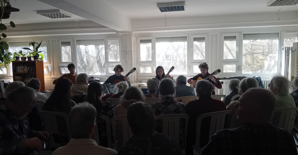 Márciusban ismét zene töltötte be a kórház termét: a Tirando gitárzenekar látogatott el hozzánk, hogy egy különleges délutánt varázsoljon pácienseinknek. Ez nem volt új találkozás – Telek Judit, a budakalászi KAMI gitártanára évek óta hűséges zenésze és szervezője a kórházi koncerteknek, különböző formációban, mindig megújulva. Az a fajta elköteleződés ez, amely nem kötelességből, hanem szívből fakad – és a hallgatók mindig megérzik.