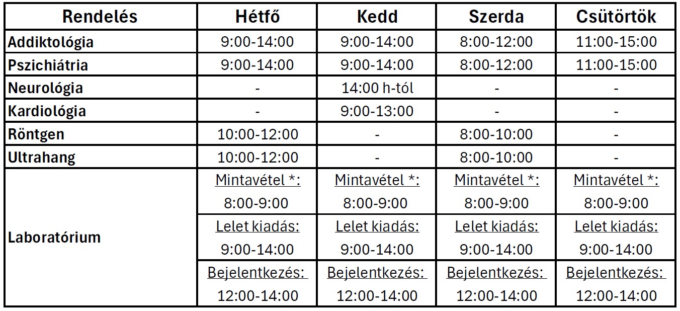 Kardiológia-, ideggyógyászat- ellátás-, ultrahang és röntgen vizsgálatokra, a laboratóriumba vérvételre telefonon előzetesen időpontot kell kérni. Ezen rendelések és a laboratóriumi vizsgálatok a területi ellátási kötelezettség szabályai szerint beutalóval térítésmentesek.