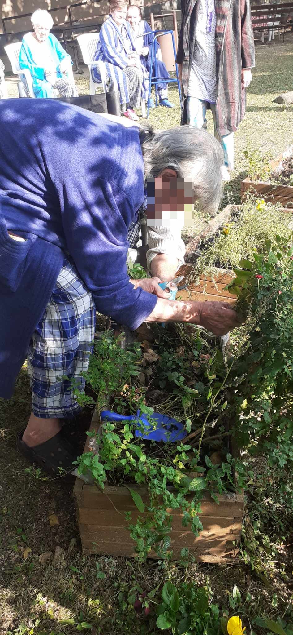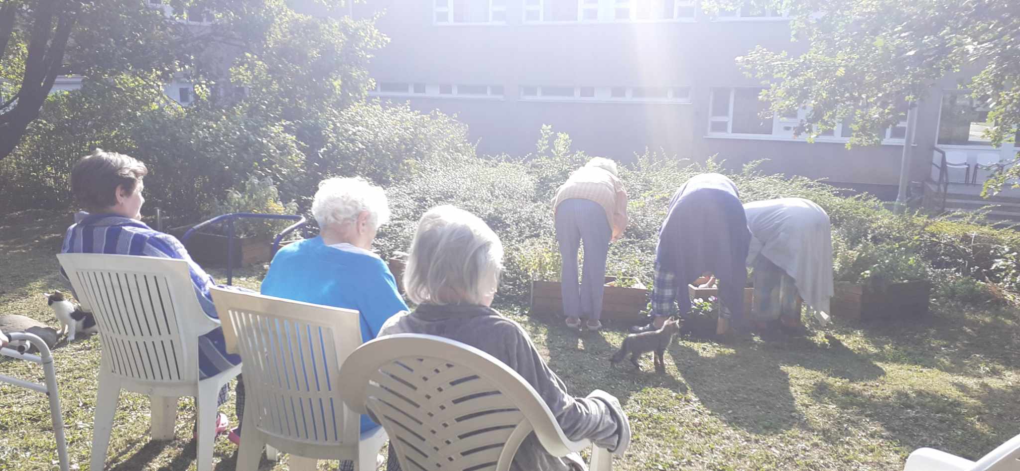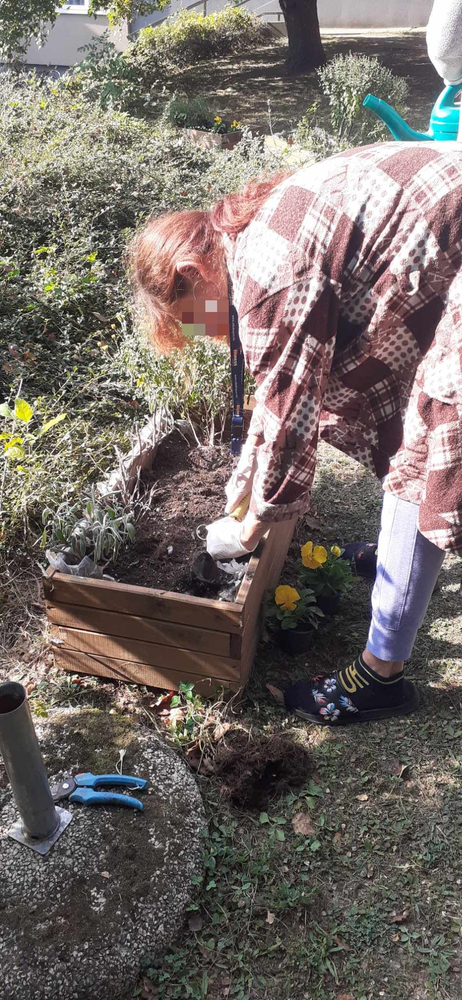 2023.10.14-én, az ősz a legbarátságosabb arcát mutatta: verőfényes napsütésben, kellemes melegben cseréltük ki az egynyári virágokat a jövő tavaszig nyíló árvácskákra. A betegek együtt lazították fel a virágládák földjét, szedték ki a cserepekből a palántákat, de volt olyan, aki a vizesvödröt cipelte, vagy a gazokat gyűjtötte halomba. A kertben lakó kismacskák kiváncsian és nagyon aktívan vettek részt az ültetés összes fázisában. A munka végeztével jól esett békésen üldögélve sütkérezni egy kicsit.